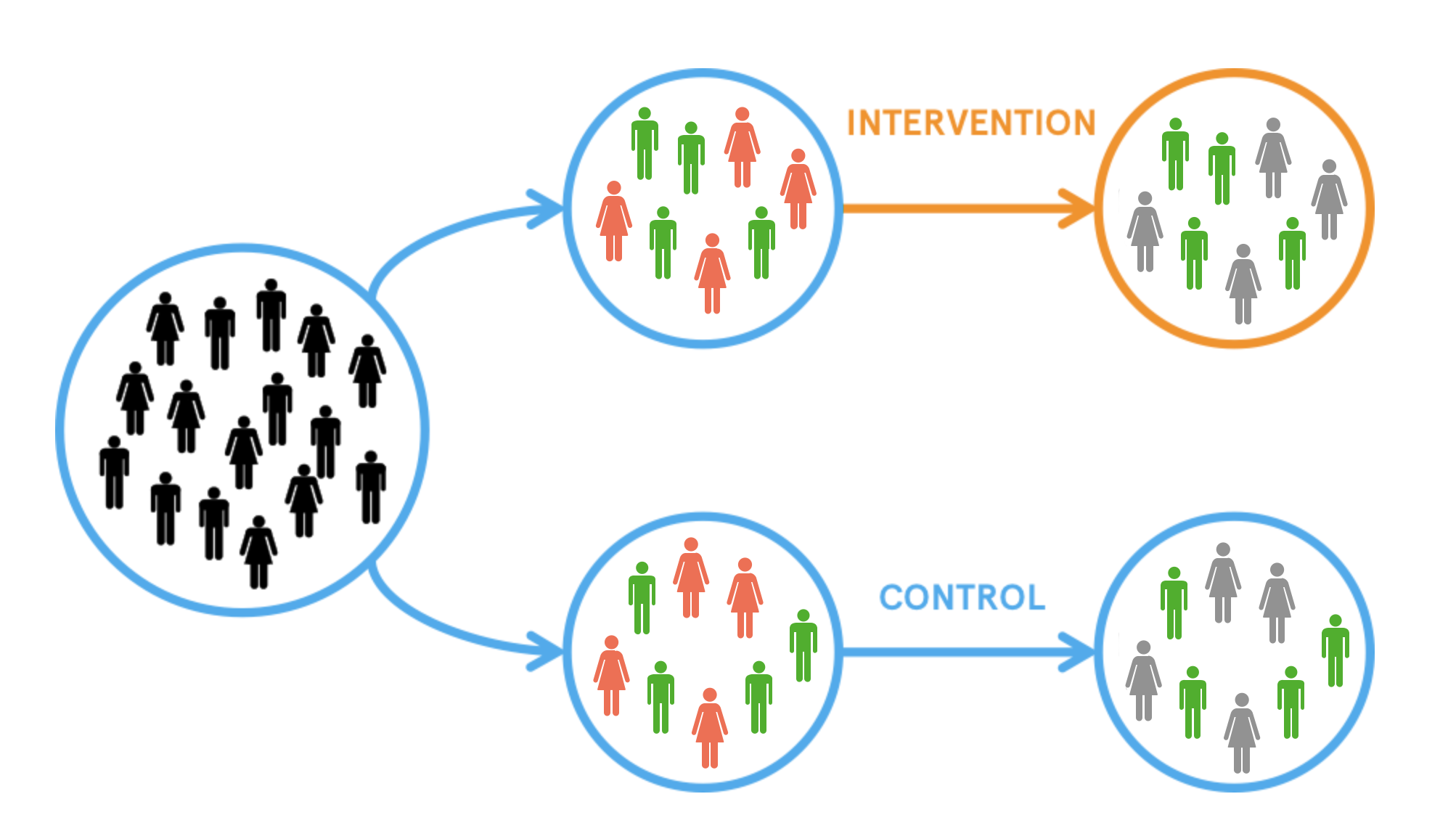 - 두 그룹으로 집단을 randomly assign(무선/무작위 배정/할당): 모든 면에서 동질한 성향을 가짐. 예를 들어, 두 집단의 연령이 평균적으로 동일해짐.